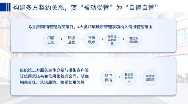 同時(shí),構(gòu)建多方契約關(guān)系,變“被動(dòng)受管”為“自律自管”。以沿街商鋪管理為突破口,在“門(mén)前五包”的基礎(chǔ)上,將環(huán)境衛(wèi)生、市容秩序、餐廚廢棄物處置、餐飲油煙防治等4大類(lèi)75項(xiàng)城市管理事項(xiàng)納入信用管理范圍,并組織環(huán)衛(wèi)保潔、餐廚廢棄物收運(yùn)、餐飲油煙治理等第三方服務(wù)主體分別與沿街商戶(hù)簽訂信用承諾書(shū)和信用化管理合同,明確相關(guān)責(zé)任,承諾履約,接受信用獎(jiǎng)懲。截至2022年11月,市區(qū)229條重點(diǎn)道路20201戶(hù)沿街商鋪組織簽訂信用承諾書(shū)20201份和信用化管理合同6.2萬(wàn)份,實(shí)現(xiàn)沿街商戶(hù)100%全覆蓋。