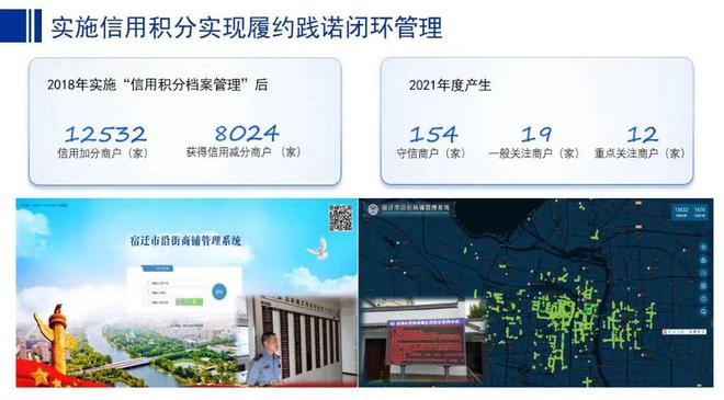 此外,宿遷市實(shí)施信用積分,實(shí)現(xiàn)履約踐諾閉環(huán)管理。沿街商鋪實(shí)行“一戶(hù)一碼”管理,建立商戶(hù)信用積分檔案,城市管理人員采取巡查檢查、視頻監(jiān)控等措施,根據(jù)商鋪履約守諾情況,實(shí)行信用加減分管理。累計(jì)扣滿(mǎn)30分、60分、100分的,分別計(jì)入一般關(guān)注對(duì)象、重點(diǎn)關(guān)注對(duì)象和警示對(duì)象。2021年度產(chǎn)生守信商戶(hù)154家、一般關(guān)注商戶(hù)19家和重點(diǎn)關(guān)注商戶(hù)12家。