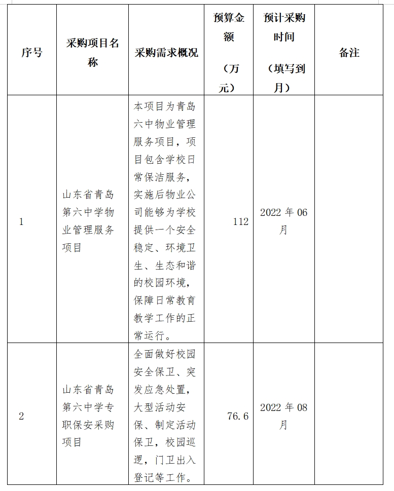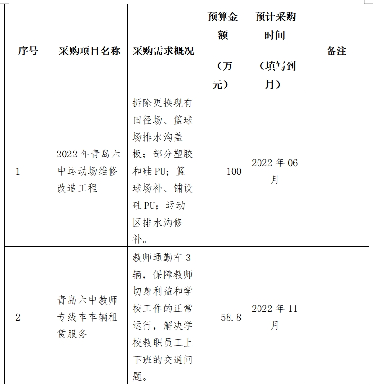 為便于供應(yīng)商及時了解政府采購信息,根據(jù)《財政部關(guān)于開展政府采購意向公開工作的通知》(財庫〔2020〕10號)等有關(guān)規(guī)定,現(xiàn)將 山東省青島第六中學(xué) 2022年 04(至)09 月采購意向公開如下:
