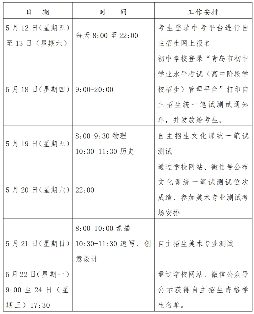 初中學(xué)校于5月18日(星期四)9:00-20:00期間登錄“青島市初中學(xué)業(yè)水平考試(高中階段學(xué)校招生)管理平臺(tái)”打印自主招生統(tǒng)一筆試測(cè)試通知單,并發(fā)放給考生。