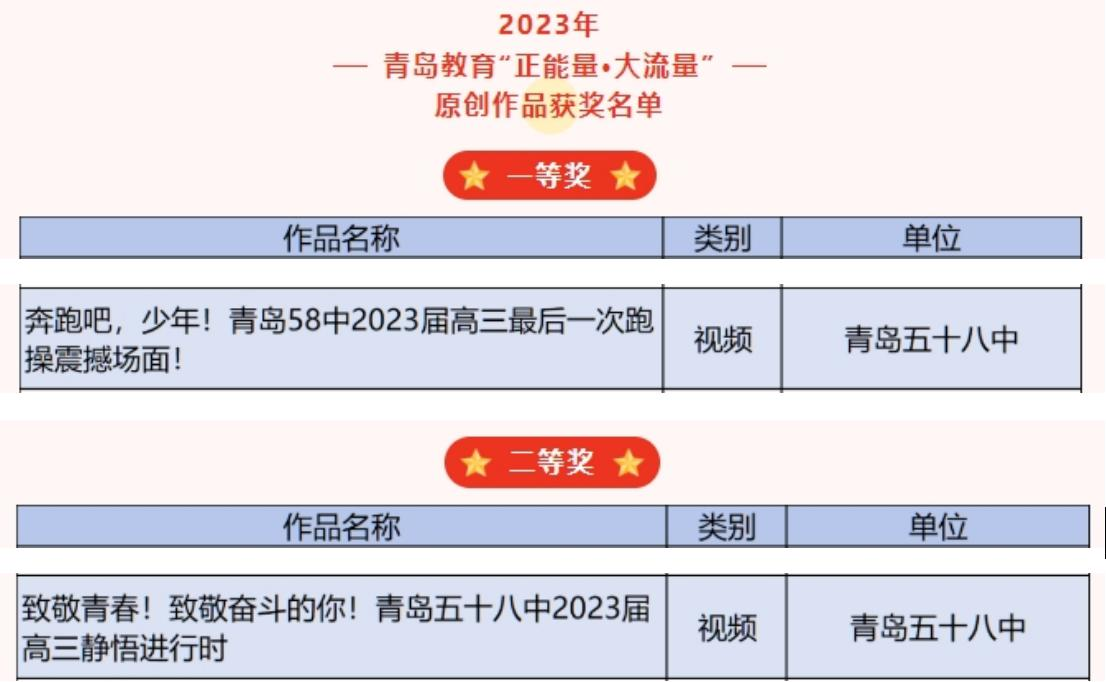 近日,青島市教育局發(fā)布了《關(guān)于公布2023年青島教育“正能量·大流量”原創(chuàng)作品獲獎(jiǎng)名單的通知》,全市共有45個(gè)作品獲一、二、三等獎(jiǎng),其中我校提報(bào)的兩個(gè)作品分獲一、二等獎(jiǎng),位列全市中小學(xué)校首位。