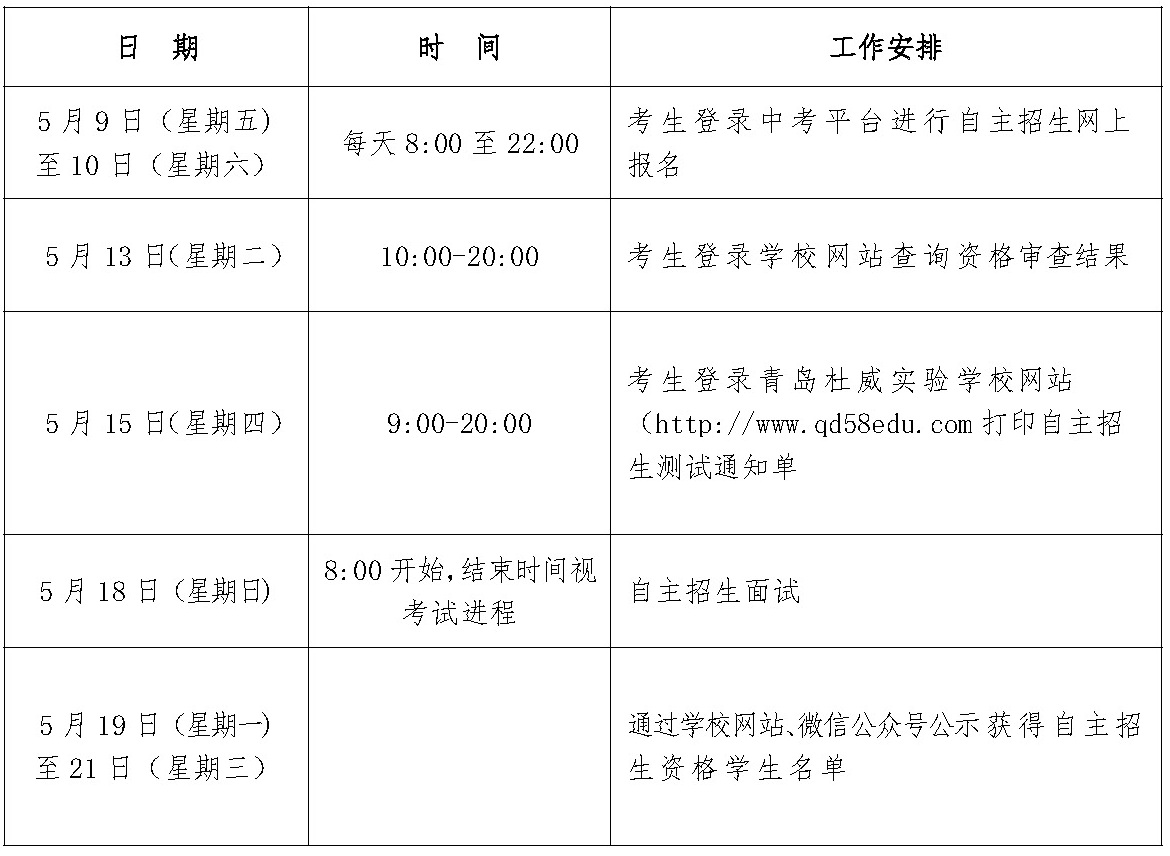 3.考生于5月15日(星期四)9:00-20:00期間登錄青島杜威實(shí)驗(yàn)學(xué)校網(wǎng)站(http://www.qd58edu.com)打印自主招生測試通知單。