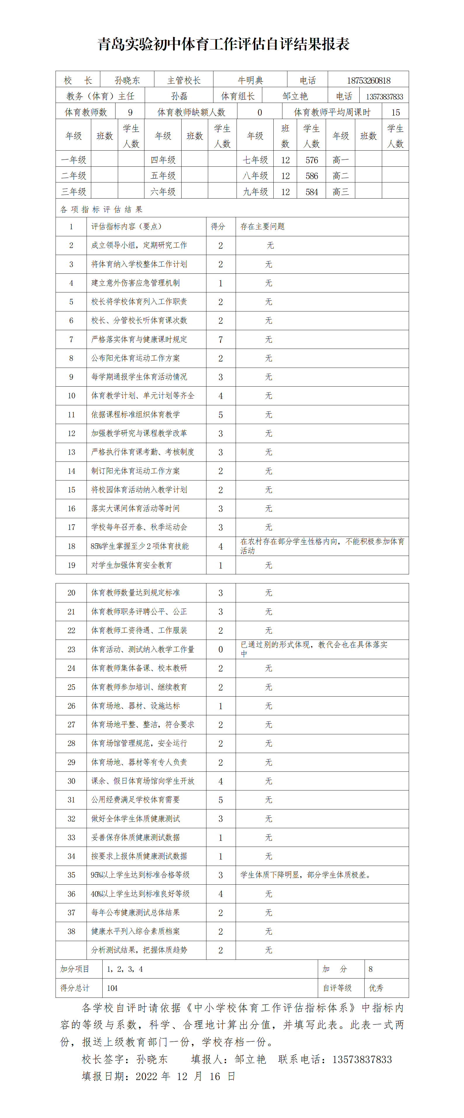 青島實驗初中2022年體育工作評估自評結果報表