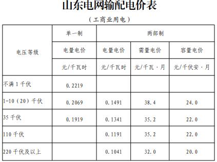 山東電網(wǎng)輸配電價表(工商業(yè)用電)