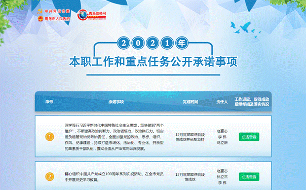 印發(fā)《2021年青島市政務(wù)公開工作要點(diǎn)》,明確重點(diǎn)工作任務(wù),細(xì)化分解責(zé)任分工。印發(fā)《青島市行政決策公眾參與辦法》,明確公眾參與行政決策的程序,推動(dòng)行政決策科學(xué)化、民主化。印發(fā)《關(guān)于做好2021年本職工作和重點(diǎn)任務(wù)公開承諾事項(xiàng)有關(guān)工作的通知》,在青島政務(wù)網(wǎng)開通專欄,及時(shí)公開各承諾事項(xiàng)的工作進(jìn)展、取得成效、后續(xù)措施、落實(shí)情況等。各區(qū)(市)全面推進(jìn)基層政務(wù)公開標(biāo)準(zhǔn)化規(guī)范化建設(shè),在完成25個(gè)領(lǐng)域基層政務(wù)公開標(biāo)準(zhǔn)化規(guī)范化目錄的基礎(chǔ)上,積極探索標(biāo)準(zhǔn)化目錄中具體事項(xiàng)的落實(shí)、公開。