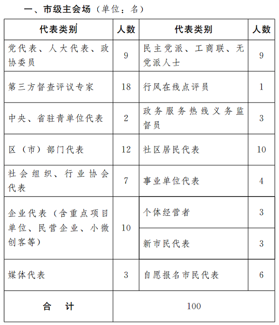 ?。ㄈ┙邮苋f名市民代表評議。通過隨機(jī)抽取、組織推薦和自愿報(bào)名相結(jié)合的方式,進(jìn)一步優(yōu)化市民代表構(gòu)成,邀請1萬名市民代表分別在市級主會(huì)場以及各區(qū)(市)和青島高新區(qū)分會(huì)場,現(xiàn)場聽取各部門述職報(bào)告,采用無記名的方式現(xiàn)場填寫并提交評議票,每組發(fā)放評議票2500張。同時(shí),組織填寫社情民意調(diào)查問卷等。市民代表的評議票當(dāng)場回收、密封,主會(huì)場與分會(huì)場評議票混合后由第三方匯總統(tǒng)計(jì),評議結(jié)果計(jì)入市政府各部門全市綜合考核成績。