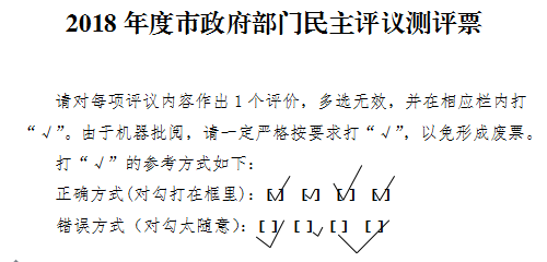 測評票上每個部門有2項評議內(nèi)容,每項評議內(nèi)容都是單選,請在相應(yīng)評議內(nèi)容對應(yīng)欄內(nèi)打“√”,多選無效。