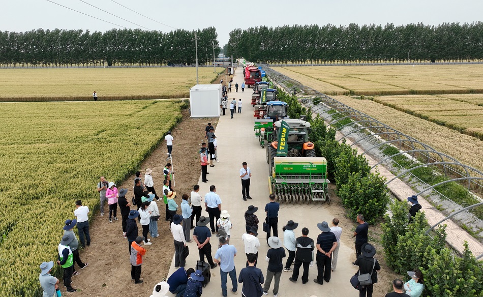 在農(nóng)機(jī)作業(yè)演示環(huán)節(jié),安裝北斗導(dǎo)航的聯(lián)合收獲機(jī)、谷物復(fù)式精量條播機(jī)、玉米免耕精量播種機(jī)等一批大功率、智能化、高性能小麥?zhǔn)斋@機(jī)械輪番作業(yè)演示。