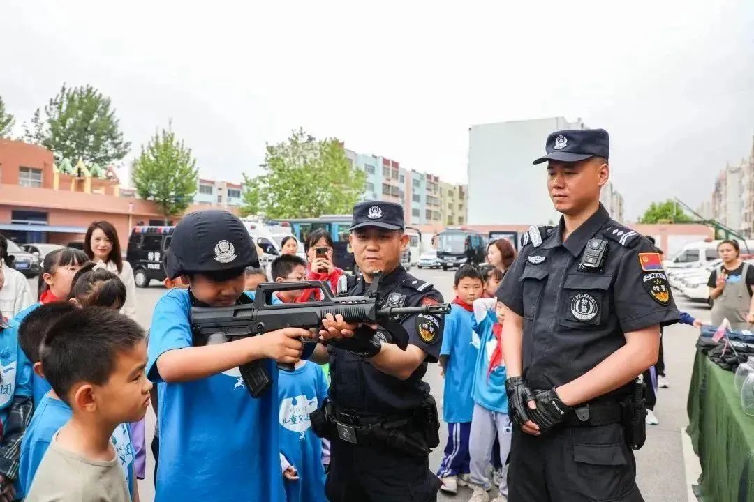 民警還向大家介紹了各式警用裝備、武器警械的特點(diǎn)和用途。在民警叔叔指導(dǎo)下,小志愿者們戴上鋼盔、拿起鋼槍,近距離接觸武器裝備,過(guò)足了“警察癮”。