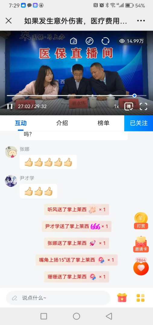 直播內(nèi)容圍繞“如果發(fā)生意外傷害,醫(yī)療費(fèi)用應(yīng)該怎么報(bào)銷,什么樣的意外傷害不能納入基本醫(yī)療保險(xiǎn)報(bào)銷”等群眾普遍關(guān)心的意外傷害報(bào)銷的熱點(diǎn)問題,以問答形式進(jìn)行了詳細(xì)解答,解答形式通俗易懂,容易理解,疏通了廣大參保人在意外傷害報(bào)銷政策上的存在的盲點(diǎn)和堵點(diǎn);結(jié)合具體案例,對參保職工的醫(yī)保個人賬戶的使用,參保人在醫(yī)療機(jī)構(gòu)就醫(yī)時應(yīng)注意的事項(xiàng),違法違規(guī)使用醫(yī)?;饝?yīng)承擔(dān)的后果進(jìn)行了詳細(xì)的講解,做到以案為鑒、以案明責(zé),形成震懾,營造宣教結(jié)合的良好氛圍;線上公開了舉報(bào)電話、投訴舉報(bào)的獎勵規(guī)定,暢通投訴舉報(bào)渠道,推動全社會共同關(guān)注、支持、參與醫(yī)?;鸨O(jiān)管工作。