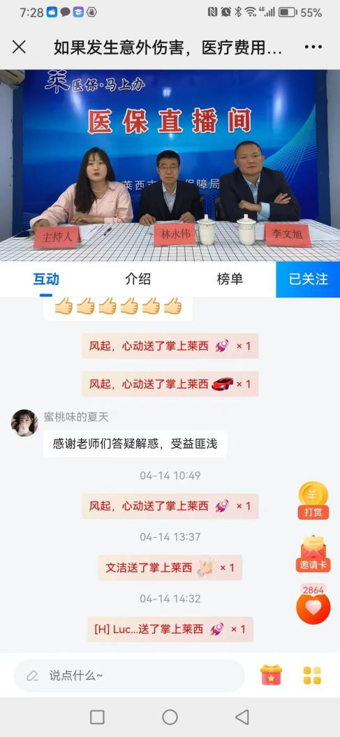 截至目前,“萊醫(yī)?!ゑR上辦”醫(yī)保直播已完成四場直播,累計(jì)觀看人數(shù)超50萬人次。面對網(wǎng)友接連不斷地提問,參與直播的工作人員一邊宣傳政策,一邊對大家提出的問題詳細(xì)答復(fù),引發(fā)網(wǎng)友紛紛點(diǎn)贊。