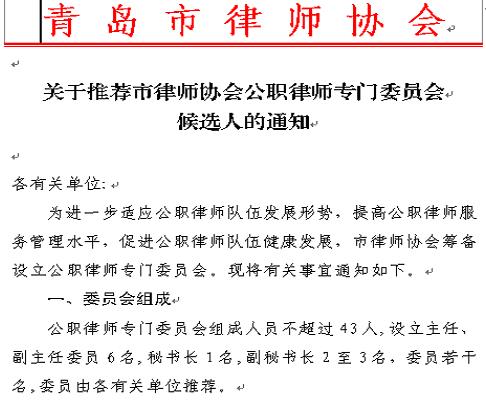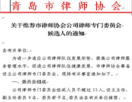 一、積極籌備成立兩公律師專委會(huì)。市律協(xié)通過向山東省律師協(xié)會(huì)、國(guó)內(nèi)其他地市律師協(xié)會(huì)調(diào)研,目前全國(guó)范圍內(nèi)設(shè)立兩公律師專委會(huì)有單獨(dú)設(shè)立一個(gè)兩公律師專委會(huì)和分別設(shè)立公職律師、公司律師兩個(gè)專委會(huì)兩種形式。青島市律師協(xié)會(huì)考慮到我市兩公律師隊(duì)伍的不斷發(fā)展壯大,直接分設(shè)兩個(gè)專門委員會(huì)將一步到位,便于分類指導(dǎo),具有創(chuàng)新性。決定在專門委員會(huì)中增設(shè)公職律師專門委員會(huì)和公司律師專門委員會(huì)兩個(gè)委員會(huì)。目前市律師協(xié)會(huì)已完成設(shè)立方案擬定、會(huì)長(zhǎng)會(huì)研究通過等工作,正在組織有關(guān)單位推薦報(bào)名。