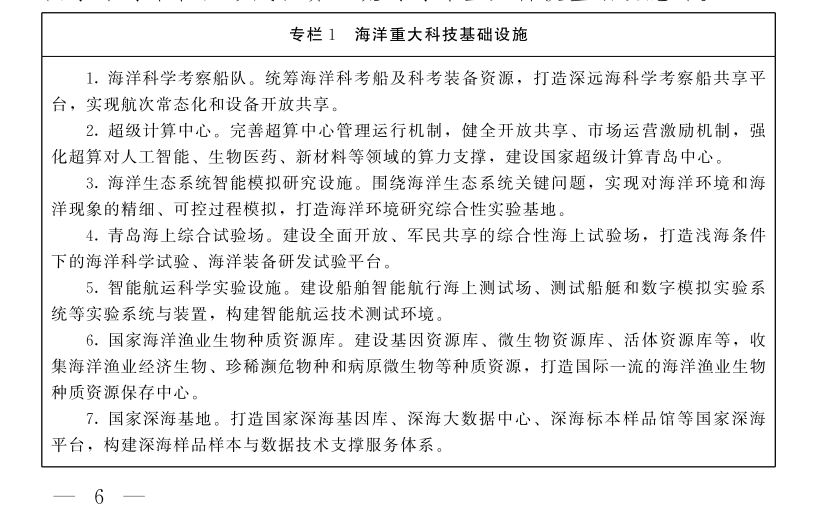 按照“成熟一項、啟動一項”原則,開展海洋重大科技基礎(chǔ)設(shè)施預(yù)研。依托青島海洋科學(xué)與技術(shù)試點國家實驗室、中科院海洋大科學(xué)研究中心等,鼓勵和引導(dǎo)多元化投資,建設(shè)重大科技基礎(chǔ)設(shè)施。加快推進海洋生態(tài)系統(tǒng)智能模擬研究設(shè)施、海上綜合試驗場、智能航運科學(xué)實驗設(shè)施等建設(shè),探索超級計算中心、海洋科學(xué)考察船隊等市場化運營,建設(shè)國家海洋漁業(yè)生物種質(zhì)資源庫,支持國家深海基地打造深海大數(shù)據(jù)中心、深海標本樣品館等國家深海平臺,形成世界一流的海洋重大科技基礎(chǔ)設(shè)施群。專欄1海洋重大科技基礎(chǔ)設(shè)施1.海洋科學(xué)考察船隊。統(tǒng)籌海洋科考船及科考裝備資源,打造深遠??茖W(xué)考察船共享平臺,實現(xiàn)航次常態(tài)化和設(shè)備開放共享。