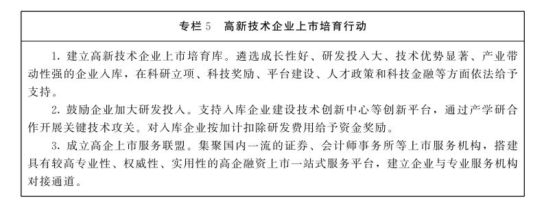 1.深化高新技術(shù)企業(yè)上市培育。實施高新技術(shù)企業(yè)上市培育行動,加強對高新技術(shù)企業(yè)服務(wù)指導(dǎo),建立動態(tài)管理的上市培育庫,“一企一專班”做好服務(wù),搭建“發(fā)現(xiàn)一批、服務(wù)一批、推出一批”的高新技術(shù)企業(yè)上市培育機制,逐步形成良好有序的企業(yè)發(fā)展梯隊。強化對擬上市高新技術(shù)企業(yè)精準扶持,支持企業(yè)與科創(chuàng)板、創(chuàng)業(yè)板、主板等多層次資本市場有效對接、做優(yōu)做強,成為爆發(fā)式成長、競爭力突出的高科技頭部企業(yè)。到2025年,上市高新技術(shù)企業(yè)總數(shù)達到50家。專欄5高新技術(shù)企業(yè)上市培育行動1.建立高新技術(shù)企業(yè)上市培育庫。遴選成長性好、研發(fā)投入大、技術(shù)優(yōu)勢顯著、產(chǎn)業(yè)帶動性強的企業(yè)入庫,在科研立項、科技獎勵、平臺建設(shè)、人才政策和科技金融等方面依法給予支持。