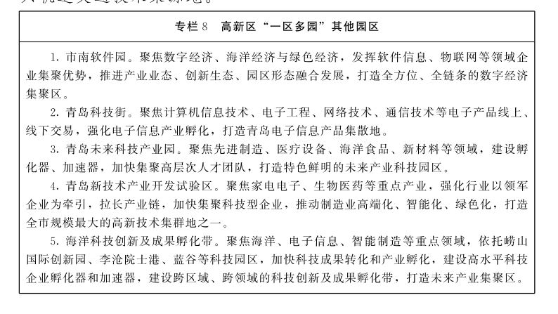 5.青島軌道交通產(chǎn)業(yè)示范區(qū)。聚焦軌道交通裝備制造、新能源新材料等主導(dǎo)產(chǎn)業(yè),依托國家高速列車技術(shù)創(chuàng)新中心等平臺建設(shè),強化央地協(xié)同創(chuàng)新,發(fā)展中國標準高速動車組、先進適用城市軌道、列車自主運行系統(tǒng)等譜系化產(chǎn)品,構(gòu)建匯聚全球高速列車技術(shù)創(chuàng)新鏈、產(chǎn)業(yè)鏈和資金鏈的全新生態(tài),打造國際高端新興軌道交通技術(shù)策源地。專欄8高新區(qū)“一區(qū)多園”其他園區(qū)1.市南軟件園。聚焦數(shù)字經(jīng)濟、海洋經(jīng)濟與綠色經(jīng)濟,發(fā)揮軟件信息、物聯(lián)網(wǎng)等領(lǐng)域企業(yè)集聚優(yōu)勢,推進產(chǎn)業(yè)業(yè)態(tài)、創(chuàng)新生態(tài)、園區(qū)形態(tài)融合發(fā)展,打造全方位、全鏈條的數(shù)字經(jīng)濟集聚區(qū)。