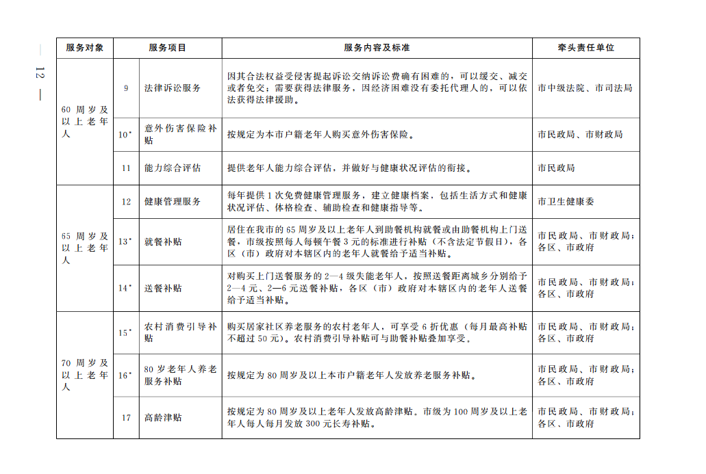 5.落實老年人優(yōu)待制度。按規(guī)定落實老年人免費乘坐城市公共交通工具、免費進入公共文化設施、按照時段免費或半價使用政府興辦或支持的公共體育設施,落實就醫(yī)便利服務、法律訴訟服務等優(yōu)待制度,完善老年人意外傷害保障制度。(市民政局牽頭,市司法局、市財政局、市交通運輸局、市文化和旅游局、市衛(wèi)生健康委、市體育局、市中級人民法院按職責分工負責)