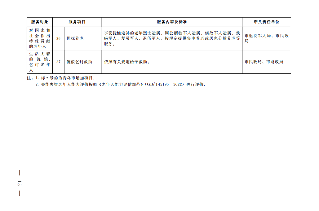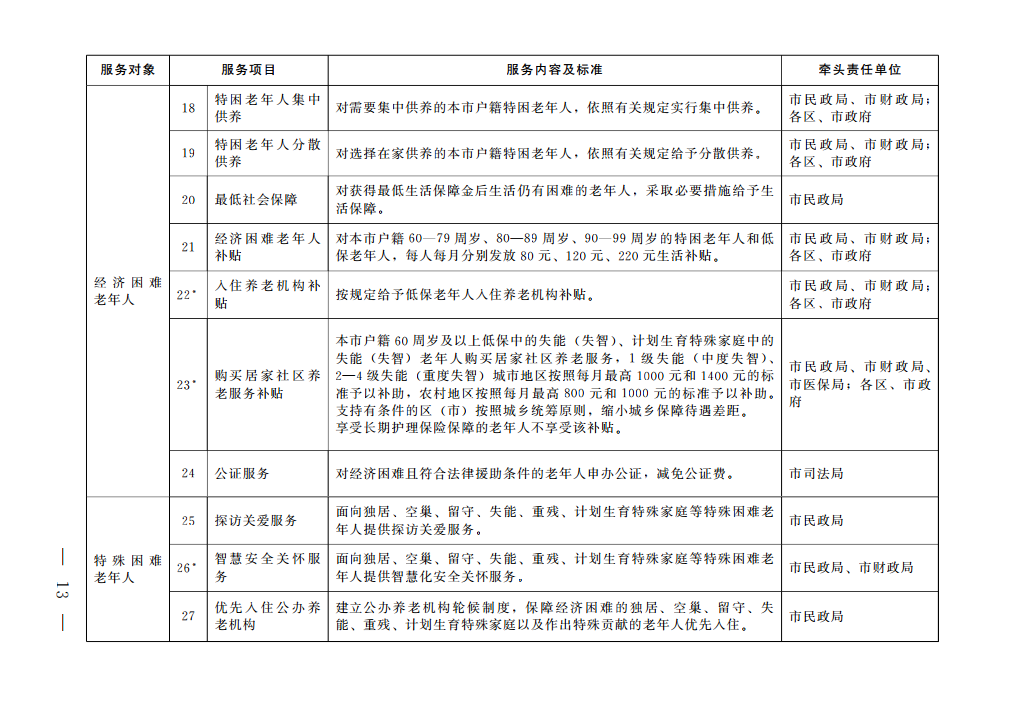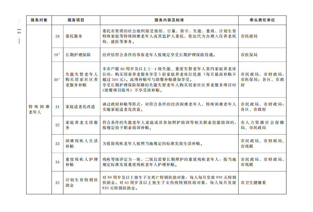 1.健全基本養(yǎng)老服務清單制度。發(fā)布基本養(yǎng)老服務清單,明確具體服務對象、項目、內容、標準等。各區(qū)(市)清單覆蓋范圍和實現程度不低于市級清單要求,并根據經濟社會發(fā)展水平、財力狀況、老年人需求等因素動態(tài)調整。建立基本養(yǎng)老服務項目統(tǒng)計調查和發(fā)布制度。(市民政局牽頭,各區(qū)、市政府負責落實。以下各項工作均需各區(qū)、市政府負責落實,不再一一列出。)