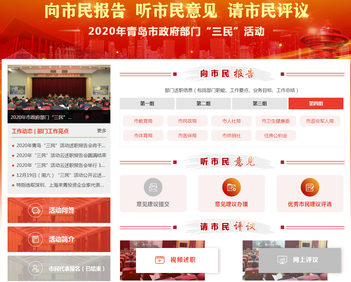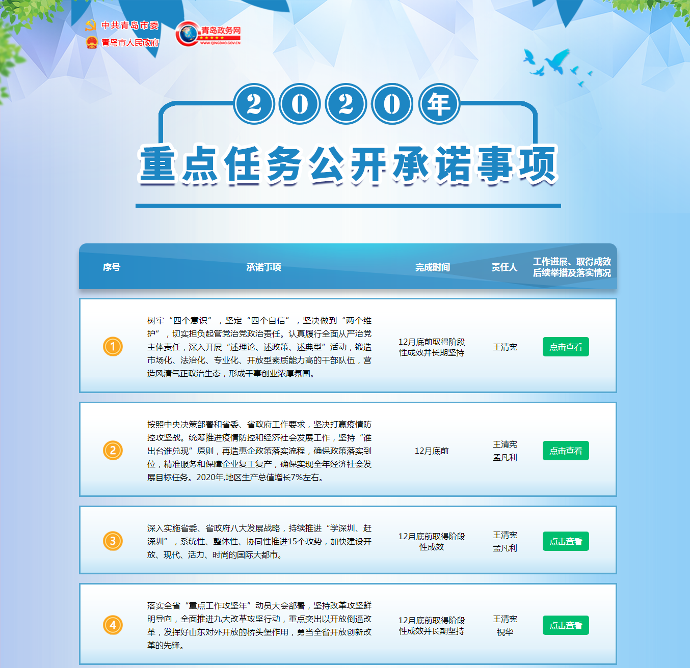 二是突出重點,把握工作導(dǎo)向。今年以來,青島市以決策、執(zhí)行、管理、服務(wù)和結(jié)果五公開為抓手,以重點領(lǐng)域信息公開為核心,以平臺建設(shè)為支撐,以機(jī)制保障為基礎(chǔ),高質(zhì)量全方位推進(jìn)政務(wù)公開工作。印發(fā)《2020年青島市政務(wù)公開工作要點》(青政辦字〔2020〕58號),從四個方面明確52項重點工作任務(wù),壓實責(zé)任單位,督促各單位主動靠前、積極作為、密切配合、協(xié)調(diào)推進(jìn),形成工作合力。加大決策公開力度。持續(xù)推進(jìn)重大決策預(yù)公開,發(fā)布《青島市政府2020年度重大行政決策事項目錄》并及時進(jìn)行調(diào)整,6項重大決策事項逐一列明承辦部門、決策時間及公眾參與方式,并對決策依據(jù)、決策草案、公開征求意見及建議采納情況等及時向社會公開。市政府各部門開門決策,通過青島政務(wù)網(wǎng)征集調(diào)查欄目發(fā)布意見征集信息33條,廣泛聽取群眾意見和建議,并將意見采納情況予以反饋。創(chuàng)新會議決策解讀形式,通過圖文、視頻等形式,對市政府常務(wù)會議常態(tài)化進(jìn)行解讀。全面梳理今年以來各級各部門制發(fā)主動公開的公文,要求制發(fā)1個工作日內(nèi)必須在有關(guān)政府門戶網(wǎng)站、政務(wù)新媒體上及時發(fā)布。深入推進(jìn)執(zhí)行公開。在青島政務(wù)網(wǎng)開通“2020年重點任務(wù)公開承諾事項”專欄,及時公開各承諾事項的工作進(jìn)展、成效、措施等。