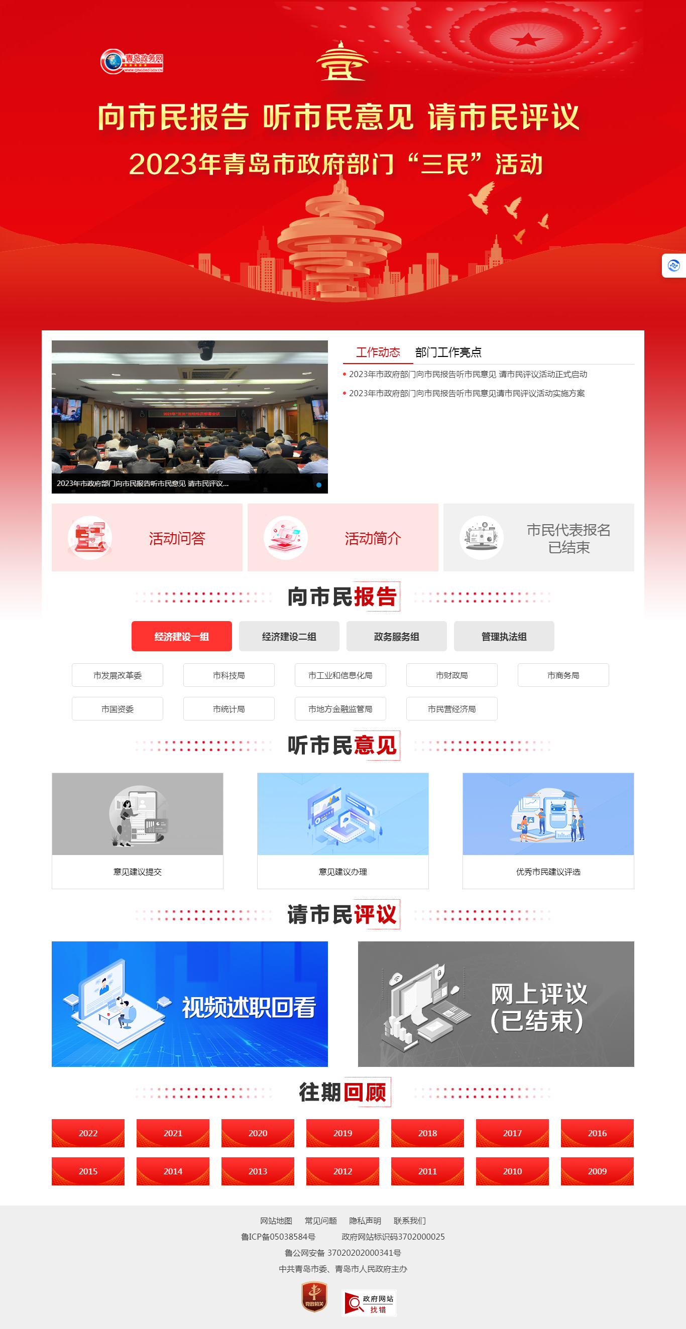二是豐富政民互動(dòng)平臺(tái)。創(chuàng)新打造“青訴即辦”訴求解決平臺(tái),將政務(wù)公開(kāi)工作與傾聽(tīng)辦理群眾訴求相結(jié)合,快速解決群眾、市場(chǎng)主體和基層“民生、發(fā)展、執(zhí)法”三大類(lèi)訴求。連續(xù)15年開(kāi)展“向市民報(bào)告、聽(tīng)市民意見(jiàn)、請(qǐng)市民評(píng)議”活動(dòng),繼續(xù)沿用線(xiàn)上“云述職、云評(píng)議、云征集”模式,組織38個(gè)政府部門(mén)通過(guò)“公開(kāi)云述職”+“局長(zhǎng)訪(fǎng)談”向市民報(bào)告工作,聽(tīng)取意見(jiàn)建議。做好 “問(wèn)政青島”“民生在線(xiàn)”“直通12345”等品牌欄目,發(fā)布“12345熱線(xiàn)指數(shù)”,為精準(zhǔn)解決民生問(wèn)題提供了“風(fēng)向標(biāo)”。