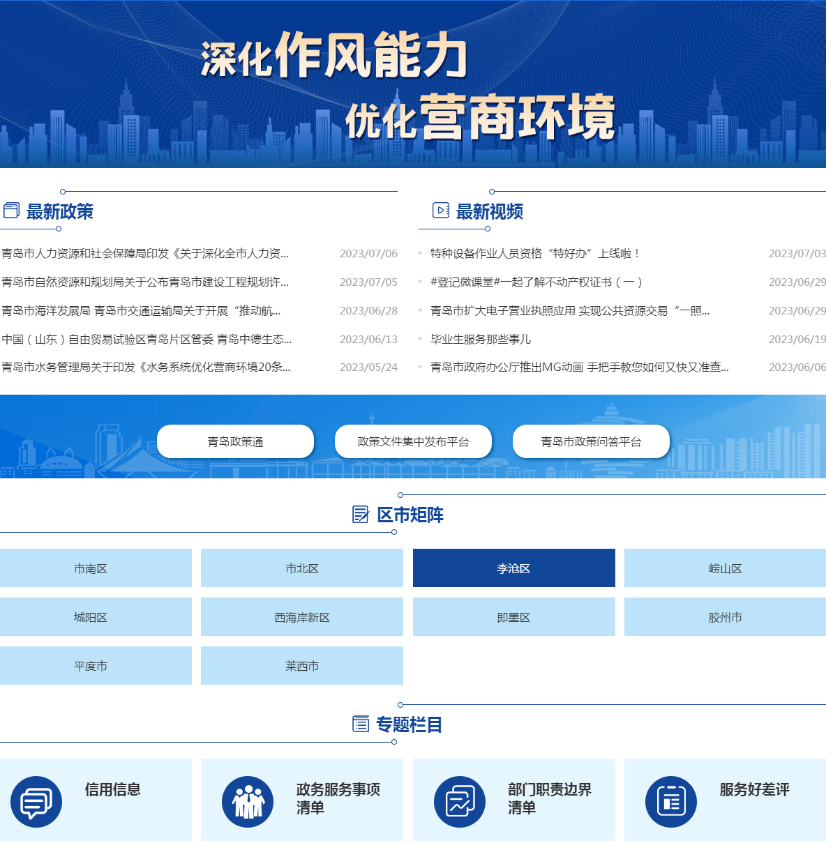 六是開(kāi)設(shè)“優(yōu)化營(yíng)商環(huán)境”專(zhuān)題專(zhuān)欄。設(shè)置“最新政策”“最新視頻”“區(qū)市矩陣”“專(zhuān)題欄目”四個(gè)欄目,整合發(fā)布各區(qū)(市)、各部門(mén)優(yōu)化營(yíng)商環(huán)境方面的政策文件、政策解讀、視頻動(dòng)畫(huà)等內(nèi)容,多角度、多層次、全面生動(dòng)地向企業(yè)和群眾呈現(xiàn)近年來(lái)我市優(yōu)化營(yíng)商環(huán)境的政策措施和特色亮點(diǎn),發(fā)布信息690余條,視頻97條。