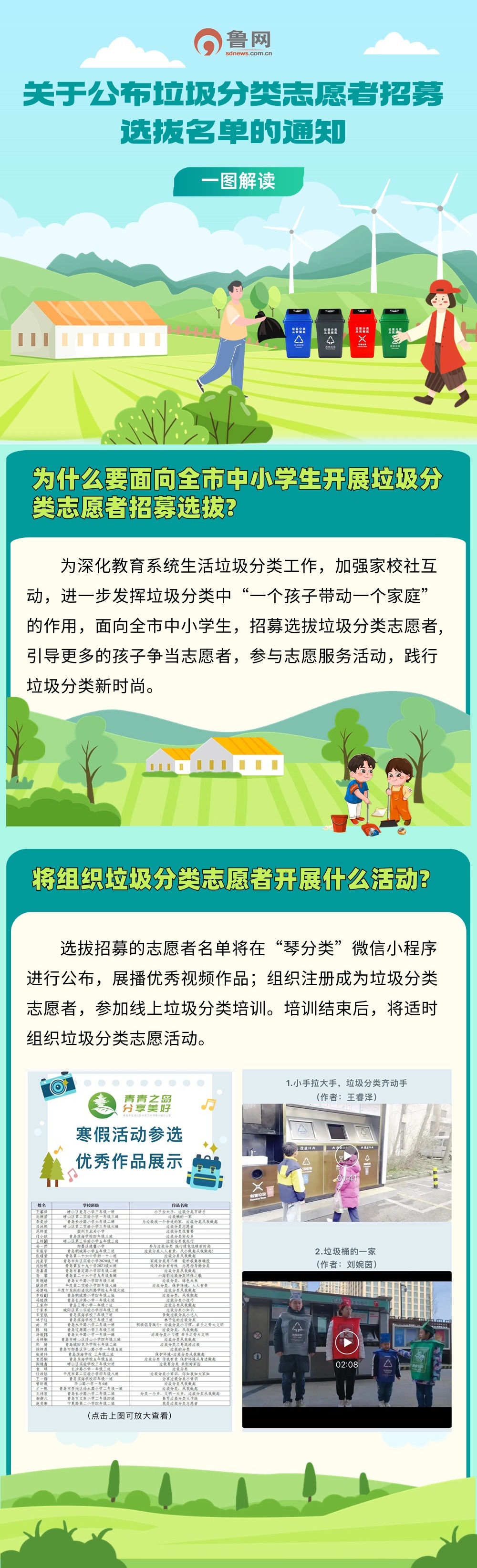 答:選拔招募的志愿者名單將在“琴分類”微信小程序進行公布,展播優(yōu)秀視頻作品;組織注冊成為垃圾分類志愿者,參加線上垃圾分類培訓(xùn)。培訓(xùn)結(jié)束后,將適時組織垃圾分類志愿活動。