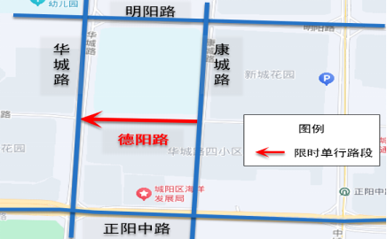 德陽路(華城路-康城路)實行東向西限時單向通行(如下圖所示行駛方向),期間禁止所有車輛由西向東行駛。