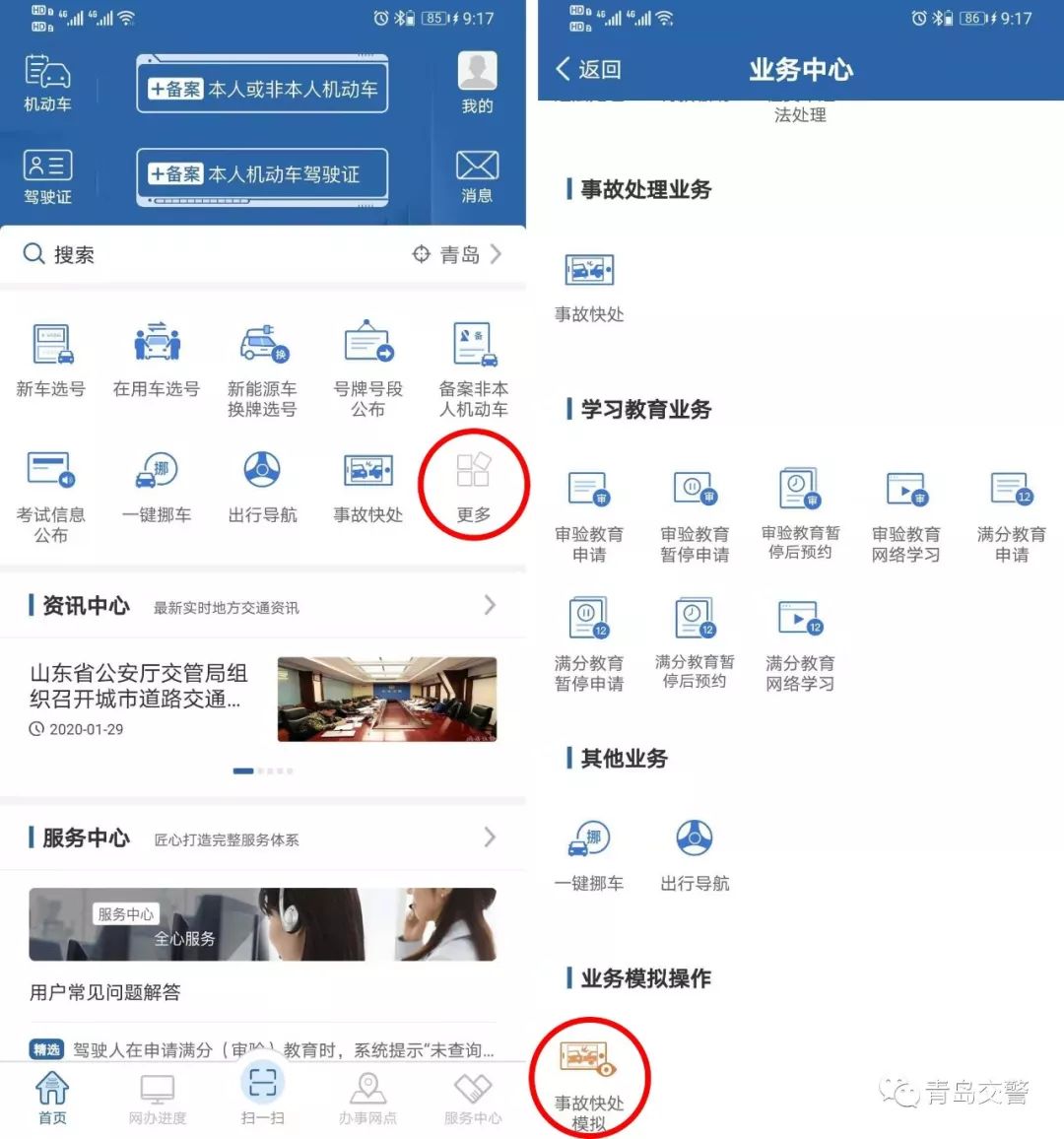 2、打開“交管12123”APP → 點(diǎn)擊更多 → 業(yè)務(wù)中心 → 業(yè)務(wù)模擬操作 → 事故快處模擬。