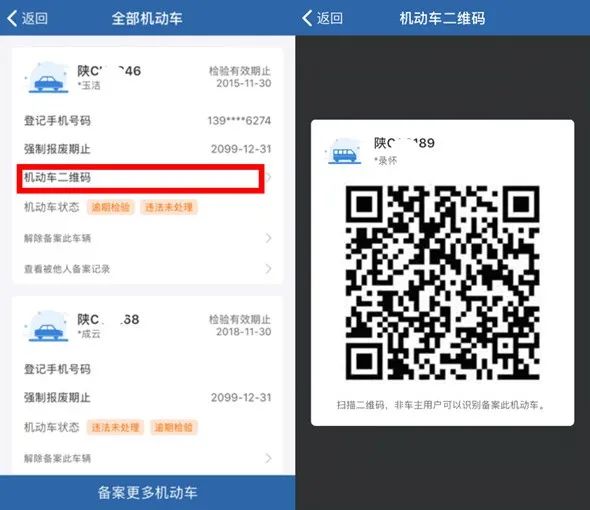 ▲個人車主用戶打開“交管12123”APP,點擊首頁左上角【機動車】-【全部機動車】,選擇待備案的機動車,生成【機動車二維碼】。