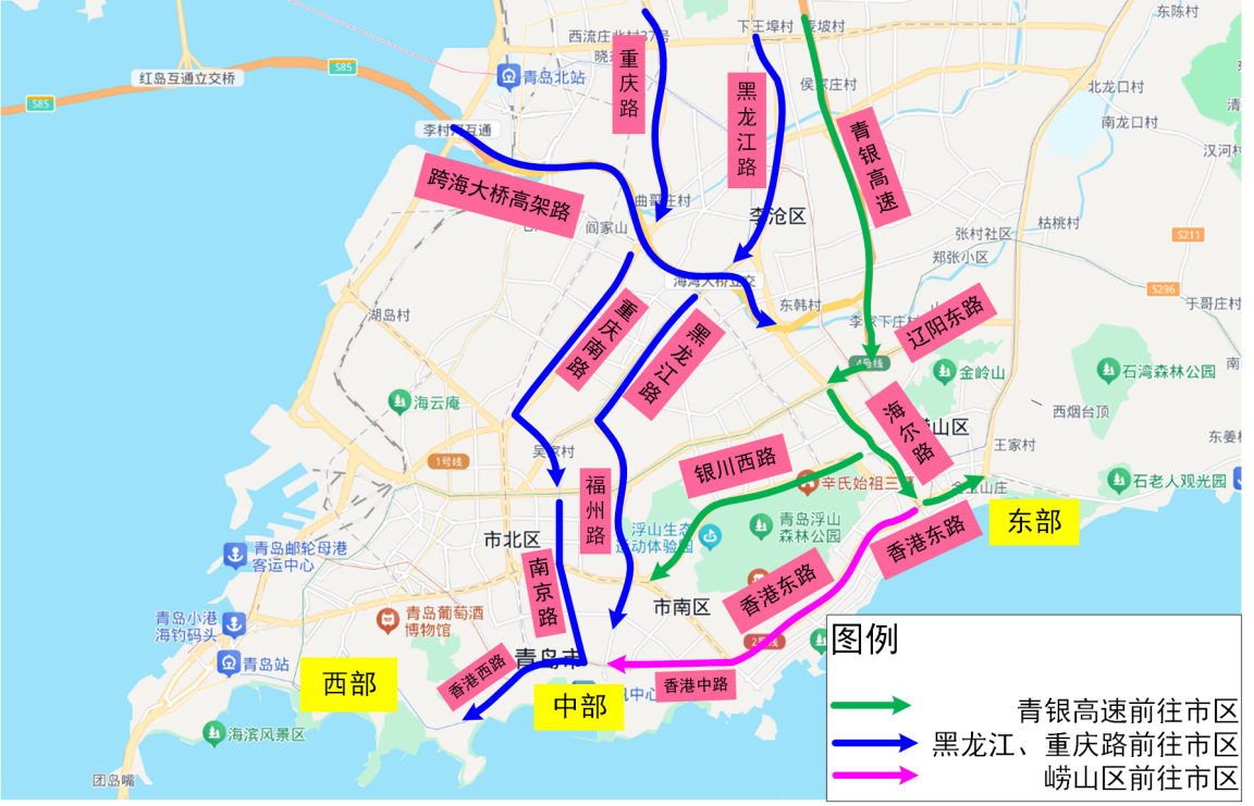 東部(小麥島—石老人區(qū)域):跨海大橋高架路→海爾路→香港東路。