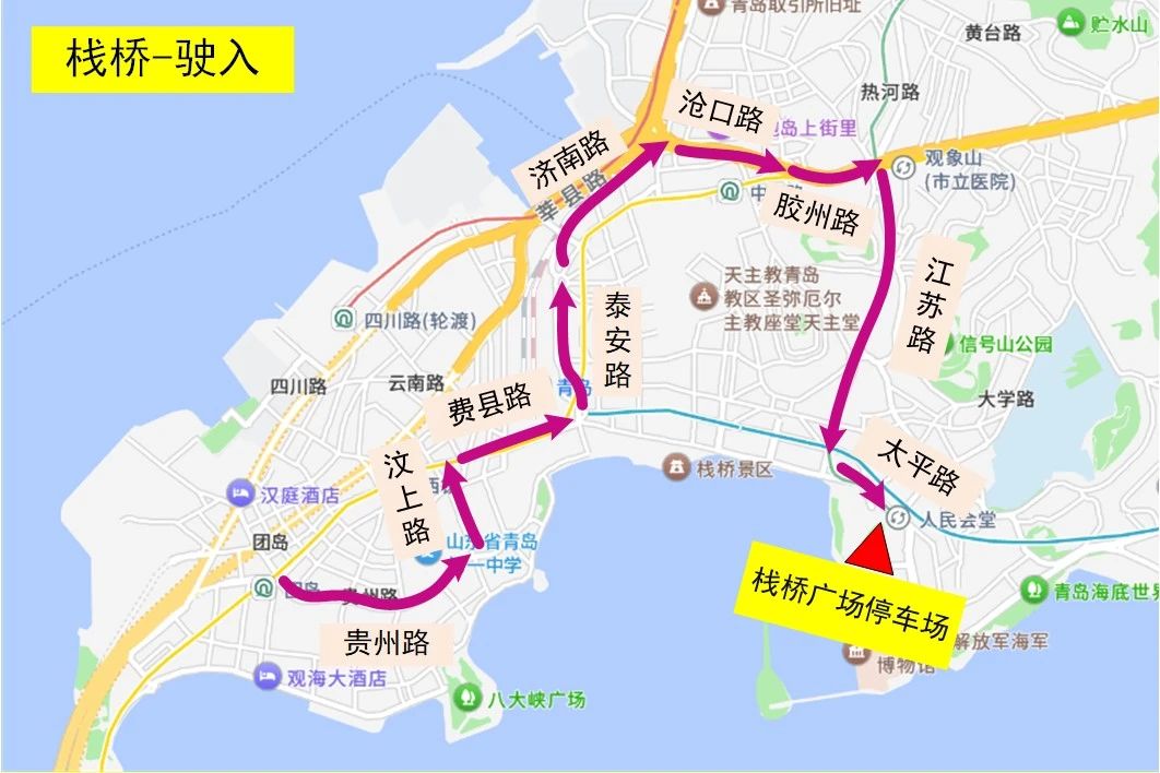駛?cè)耄嘿F州路→汶上路→費縣路→泰安路→濟南路→滄口路→膠州路→江蘇路→太平路→停車場