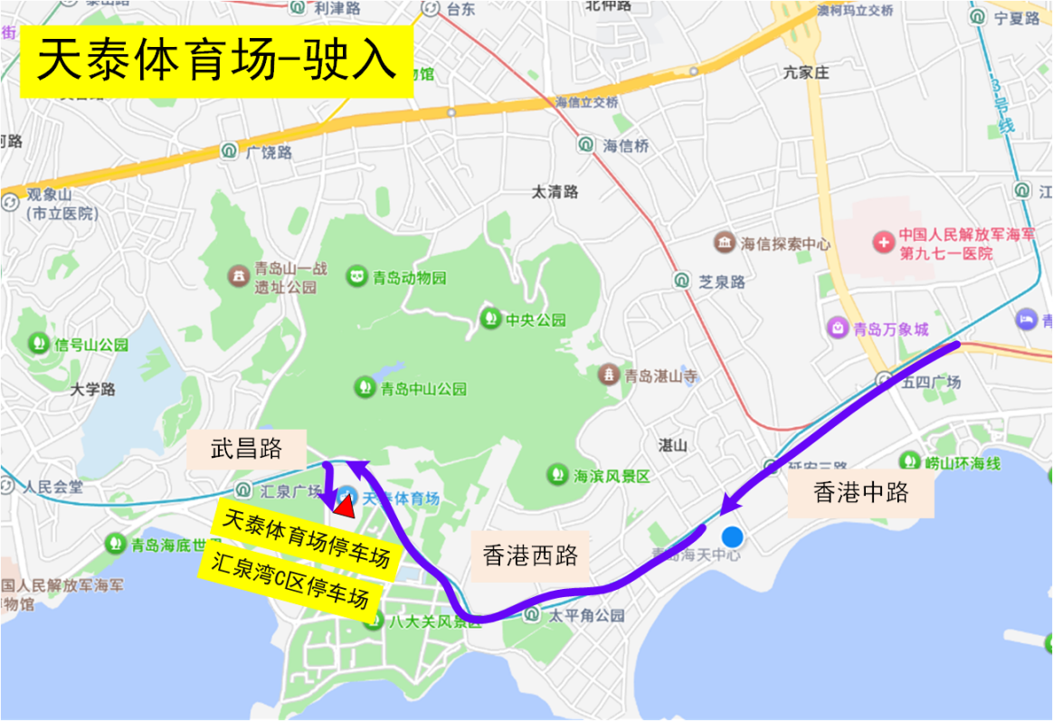 駛?cè)耄?/span>香港中路→香港西路→文登路→武昌路→停車場