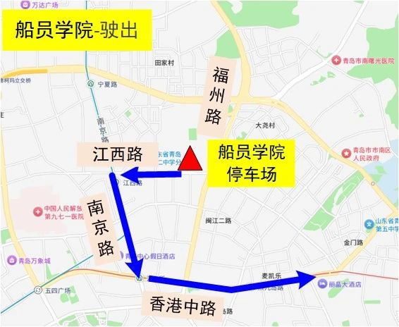 駛出2(備用路線):停車場→武昌路→香港西路(公交車專用道)→香港中路向東行駛