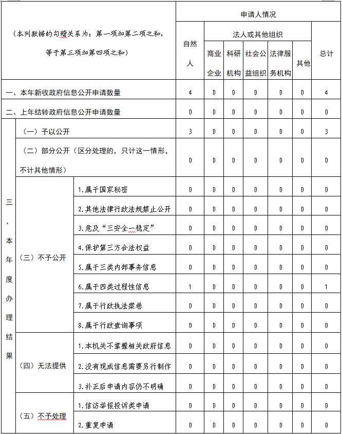 落實(shí)全省“依申請公開質(zhì)效提升年”活動要求,強(qiáng)化細(xì)化各環(huán)節(jié)工作要求,依法依規(guī)及時準(zhǔn)確予以答復(fù)反饋。本年度收到政府信息公開申請4件,均為自然人申請,從申請內(nèi)容上看,主要涉及行政執(zhí)法過程信息、住房補(bǔ)貼提取相關(guān)辦法、單位機(jī)構(gòu)設(shè)置情況、單位領(lǐng)導(dǎo)分工情況等,已按規(guī)定時限答復(fù)申請人,其中予以公開3件、不予公開1件。本年度未收到因信息公開引起的行政復(fù)議和行政訴訟。