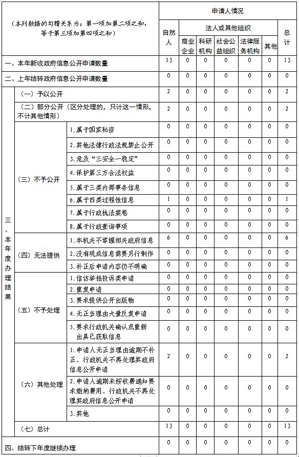 (二)依申請(qǐng)公開情況。本著認(rèn)真的態(tài)度和便民利民的原則辦理依申請(qǐng)公開件,準(zhǔn)確了解申請(qǐng)人的訴求,維護(hù)依申請(qǐng)公開受理渠道的暢通,推進(jìn)依申請(qǐng)公開標(biāo)準(zhǔn)化規(guī)范化建設(shè)。2022年,共收到申請(qǐng)政府信息公開13件次,比2021年增加6件,嚴(yán)格按照規(guī)定給予辦理、答復(fù)。