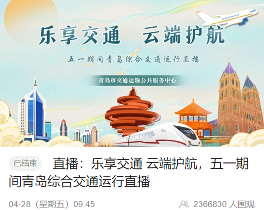為保障2023年勞動(dòng)節(jié)期間全市綜合交通運(yùn)行平穩(wěn)、暢通,4月28日,市交通運(yùn)輸公共服務(wù)中心聯(lián)合執(zhí)法支隊(duì)、山東高速集團(tuán)、濟(jì)南局集團(tuán)青島站、青島膠東國(guó)際機(jī)場(chǎng)建設(shè)有限公司等相關(guān)單位,組織開展了“樂(lè)享交通 云端護(hù)航”五一期間青島綜合交通運(yùn)行網(wǎng)絡(luò)直播。直播持續(xù)時(shí)長(zhǎng)45分鐘,觀看人次超過(guò)236萬(wàn)。