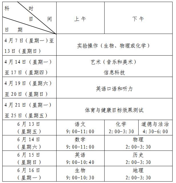 藝術、實驗操作(生物、物理或化學)、信息科技考試由各區(qū)(市)教體局在市教育局統(tǒng)一規(guī)定的時間內(nèi)安排,由各初中學校自行組織實施,考場或機房內(nèi)監(jiān)考員的半數(shù)須由外校監(jiān)考員擔任,外校監(jiān)考員由轄區(qū)教體局負責調(diào)派。
