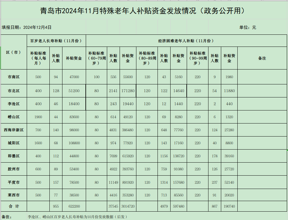 2024年11月特殊老年人補(bǔ)貼資金發(fā)放情況