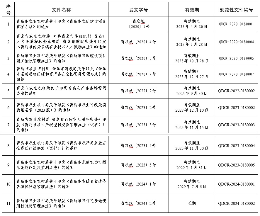 青島市農(nóng)業(yè)農(nóng)村局現(xiàn)行有效的部門行政規(guī)范性文件目錄