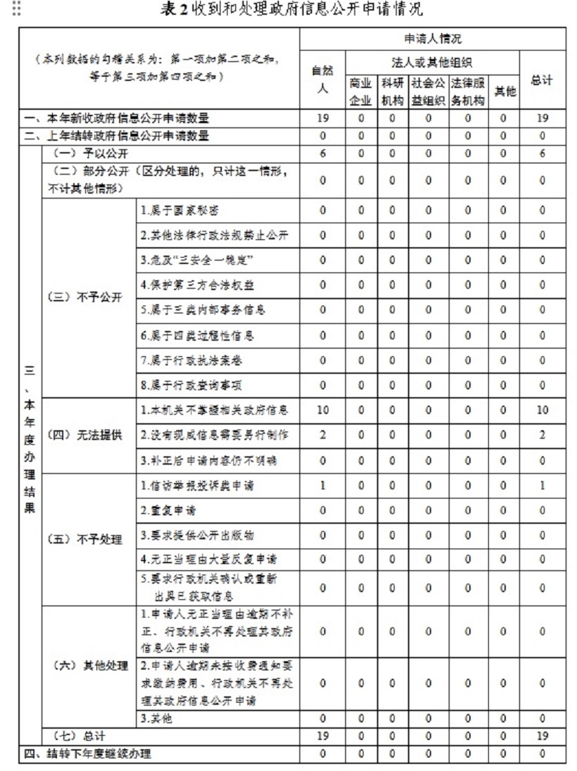 收到和處理政府信息公開(kāi)申請(qǐng)19件,均為自然人申請(qǐng),按期答復(fù)19件,其中予以公開(kāi)6件,不予公開(kāi)0件,無(wú)法提供12件,不予處理1件。