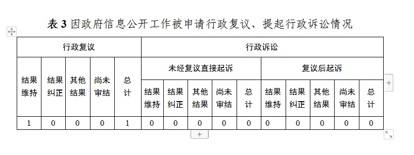 因政府信息公開(kāi)工作被申請(qǐng)行政復(fù)議1件,結(jié)果維持1件。無(wú)政府信息公開(kāi)行政訴訟情況。