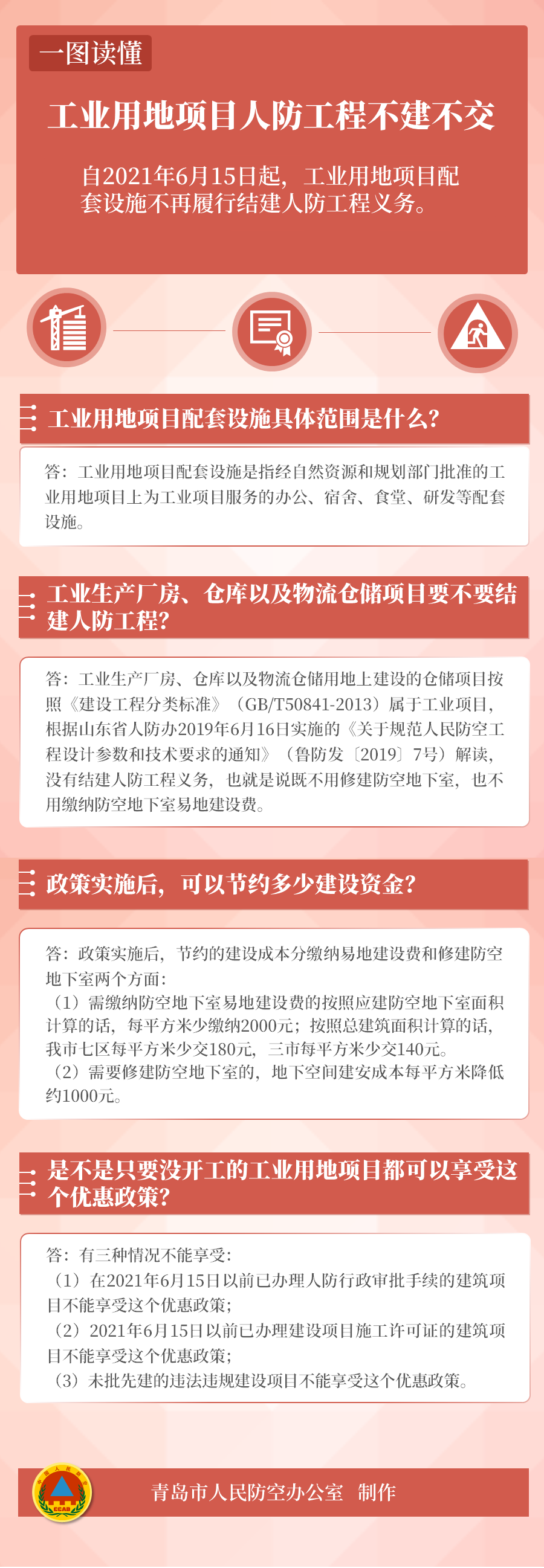 請點擊:青島市人民防空辦公室關(guān)于工業(yè)用地項目配套設(shè)施不再履行結(jié)建人防工程義務(wù)的通知