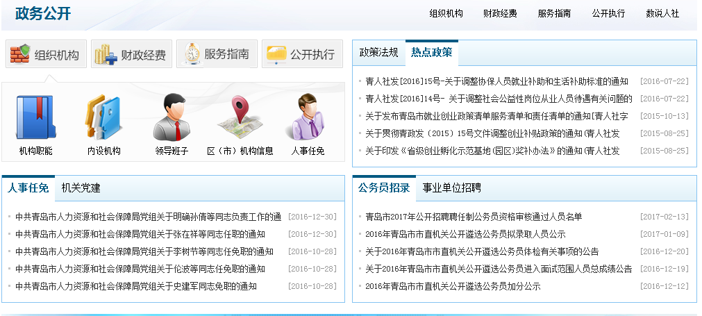 (一)推進(jìn)財(cái)政資金信息公開(kāi)。我局重點(diǎn)公開(kāi)了《2015年青島市人力資源和社會(huì)保障局“三公”經(jīng)費(fèi)決算》及《2016年度青島市人力資源和社會(huì)保障局部門(mén)預(yù)算》,內(nèi)容涉及部門(mén)收支決算,“三公”經(jīng)費(fèi)財(cái)政撥款支出決算等內(nèi)容。梳理全局100余項(xiàng)行政事業(yè)性收費(fèi)項(xiàng)目,將收費(fèi)標(biāo)準(zhǔn)和收費(fèi)依據(jù)一次性向社會(huì)全部公開(kāi)。