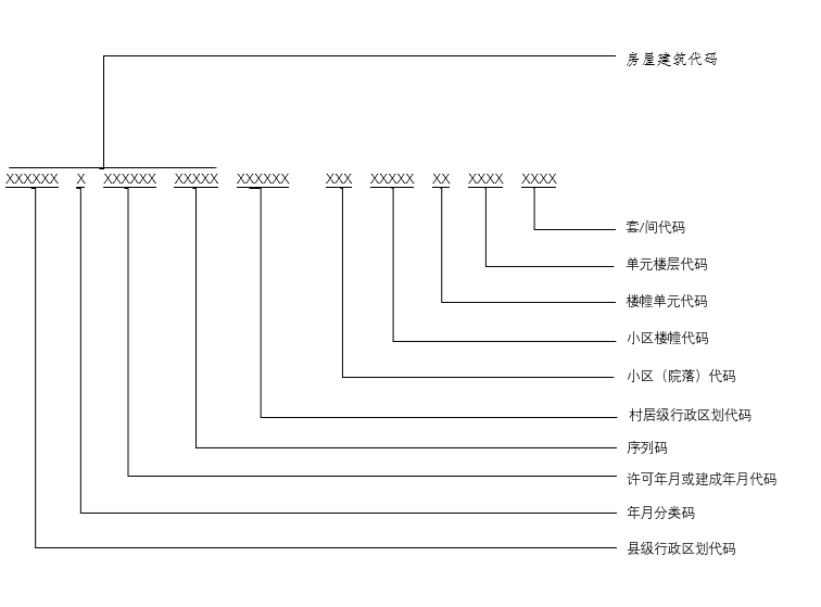第1-6位為市區(qū)縣級行政區(qū)劃代碼、第7位為年月分類碼、第8-13位為許可年月或建成年月代碼、第14-18位為序列碼、第19-24位為村居級行政代碼、第25-27位為小區(qū)(院落)代碼、第28-32位為小區(qū)樓幢代碼、第33-34位為樓幢單元代碼、第35-38位為單元樓層代碼、第39-42位為樓層套/間代碼。具體編碼方法詳見以上兩個文件。