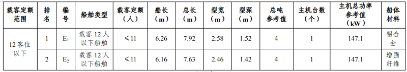 表4 載客12人以下船舶的標(biāo)準(zhǔn)化船型推薦表