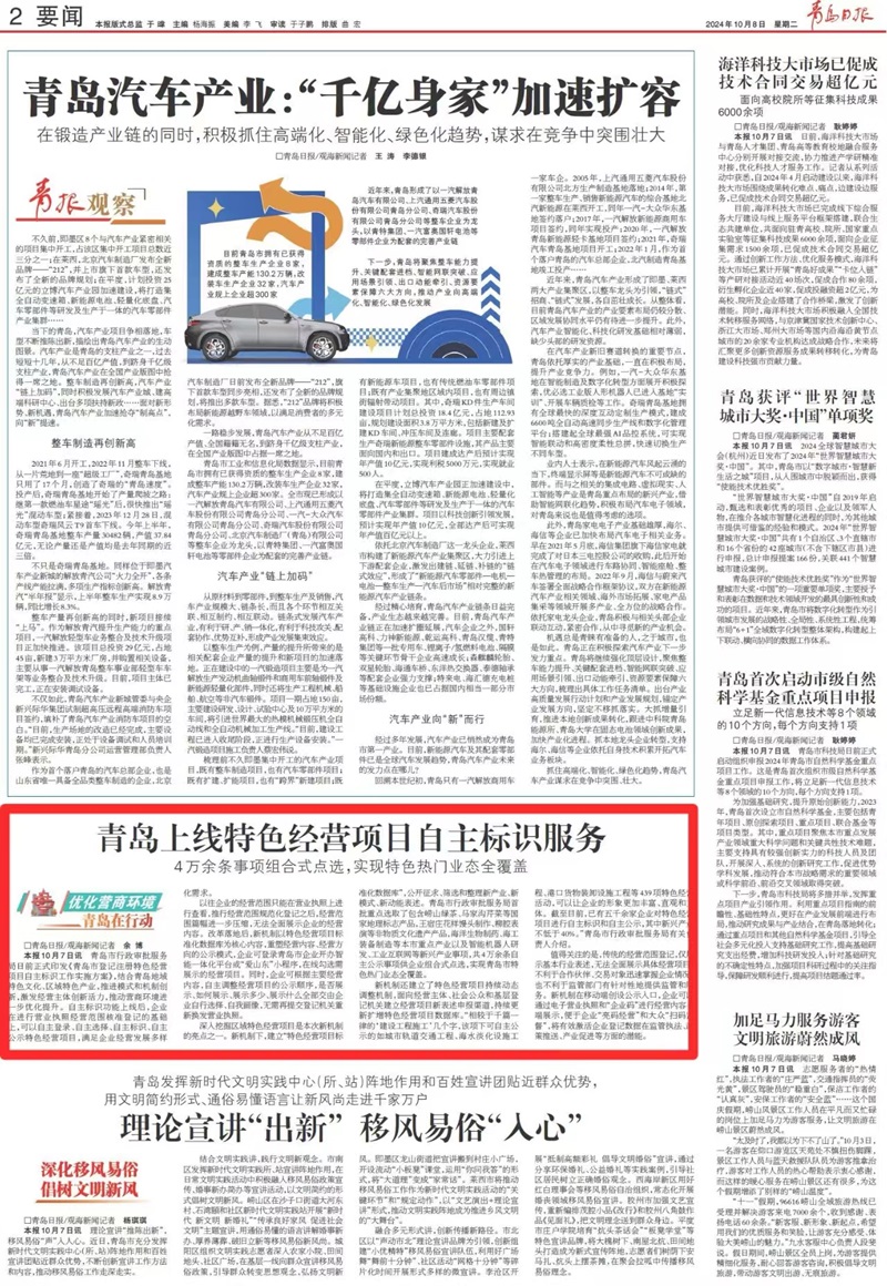 深入挖掘區(qū)域特色經(jīng)營(yíng)項(xiàng)目是本次新機(jī)制的亮點(diǎn)之一。新機(jī)制下,建立“特色經(jīng)營(yíng)項(xiàng)目標(biāo)準(zhǔn)化數(shù)據(jù)庫(kù)”,公開(kāi)征求、篩選和整理新產(chǎn)業(yè)、新模式、新動(dòng)能表述。青島市行政審批服務(wù)局首批重點(diǎn)選取了包含嶗山綠茶、馬家溝芹菜等國(guó)家地理標(biāo)志產(chǎn)品,王宿莊花樣饅頭制作、柳腔表演等非物質(zhì)文化遺產(chǎn)產(chǎn)品,海洋生物制藥、海工裝備制造等本市重點(diǎn)產(chǎn)業(yè)以及智能機(jī)器人研發(fā)、工業(yè)互聯(lián)網(wǎng)等新興產(chǎn)業(yè)事項(xiàng),共4萬(wàn)余條自主公示事項(xiàng)供企業(yè)組合式點(diǎn)選,實(shí)現(xiàn)青島市特色熱門(mén)業(yè)態(tài)全覆蓋。