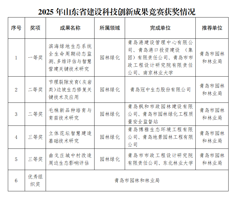 近日,山東省住房和城鄉(xiāng)建設(shè)廳、山東省總工會(huì)聯(lián)合公布了2025年山東省建設(shè)科技創(chuàng)新成果競(jìng)賽結(jié)果,全省累計(jì)427項(xiàng)成果獲獎(jiǎng),我局遴選推薦成果獲獎(jiǎng)5項(xiàng)。其中1項(xiàng)獲一等獎(jiǎng),2項(xiàng)獲二等獎(jiǎng),2項(xiàng)獲三等獎(jiǎng),同時(shí),青島市園林和林業(yè)局榮獲“優(yōu)秀組織獎(jiǎng)”稱(chēng)號(hào)。