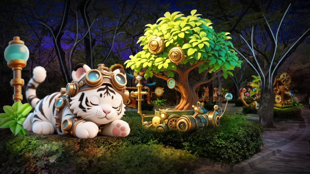 該區(qū)域位于動物園園區(qū)內(nèi),由“蒸汽時代”“時空回廊”“萌趣光廊”“童夢繪星河”“幻彩童夢”“幻羽仙鵝”等燈組組成。