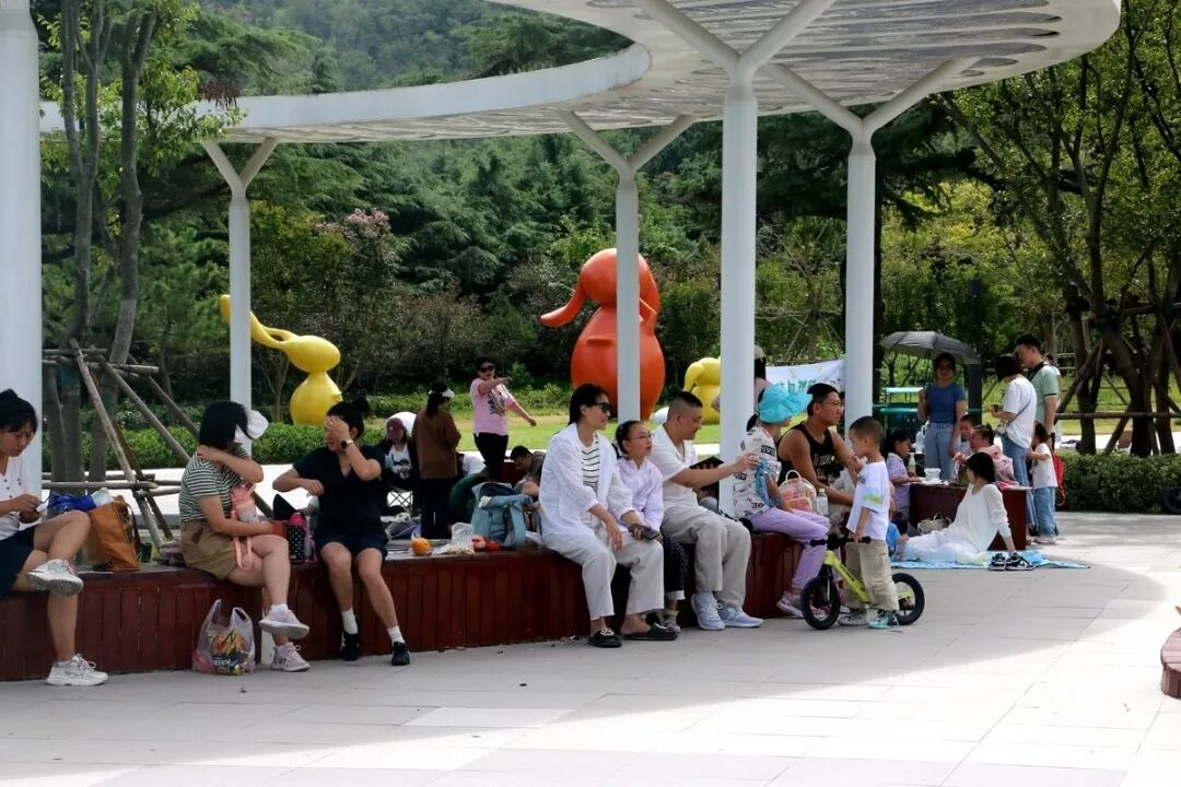 蜿蜒的木棧道依山而建,行人緩步而上,腳下木板輕響,抬頭便是層疊綠蔭;綠道上,有人騎著單車穿梭,衣角被風(fēng)掀起,笑聲落滿林間;草坪空地上,孩子們嬉鬧奔跑,幾頂帳篷搭在其間,親朋好友們閑談暢聊;不遠(yuǎn)處游樂場里,滿是孩子的雀躍呼喊,家長們坐在長椅上,笑著看孩子撒歡。