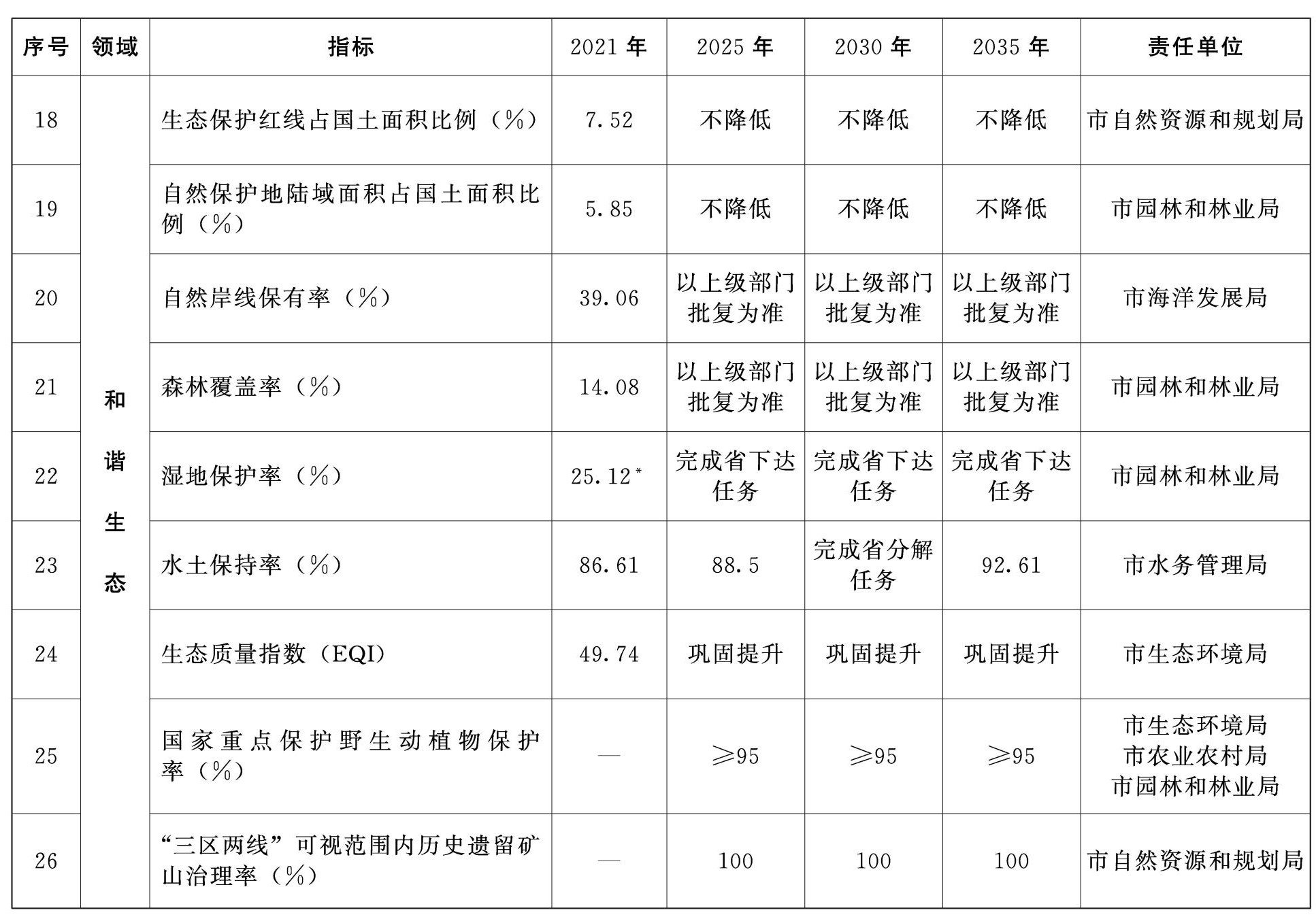 (2)生態(tài)環(huán)境保護(hù)成效持續(xù)提升。城市生態(tài)環(huán)境質(zhì)量持續(xù)提升,主要污染物排放總量持續(xù)下降,生態(tài)系統(tǒng)和生物多樣性得到有效保護(hù),生態(tài)安全得到有效保障,一流生態(tài)基底更加穩(wěn)固。重污染天氣基本消除,地表水國控?cái)嗝嫠|(zhì)優(yōu)良(達(dá)到或優(yōu)于Ⅲ類)比例達(dá)到71.4%,城鄉(xiāng)黑臭水體基本消除。近岸海域水質(zhì)優(yōu)良(一、二類)面積比例保持98.8%以上。生態(tài)質(zhì)量指數(shù)(EQI)穩(wěn)中向好,土壤安全利用水平鞏固提升。