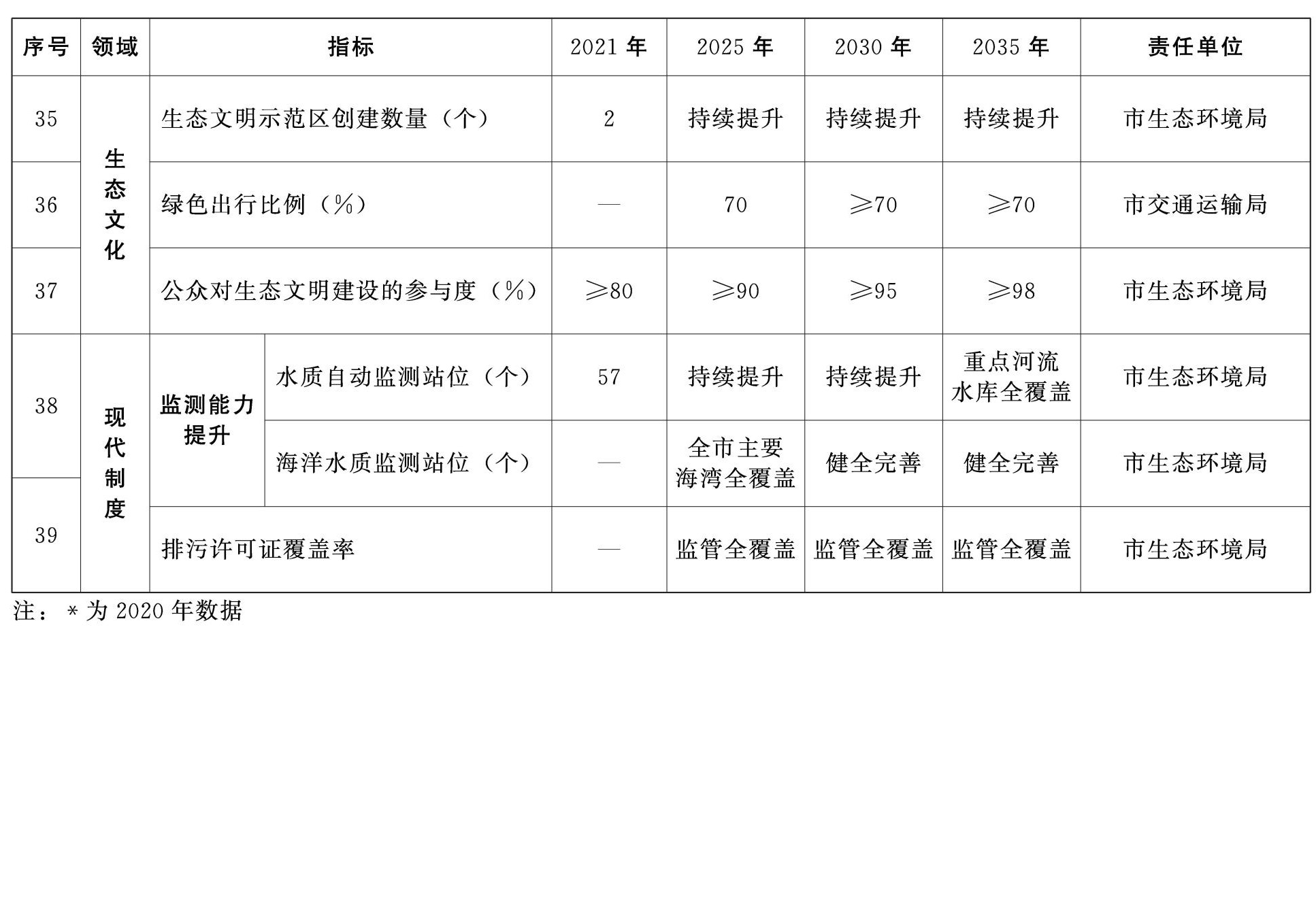 2.到2035年,人與自然和諧共生的美麗青島全面建成。城鄉(xiāng)生態(tài)環(huán)境質(zhì)量根本好轉(zhuǎn),綠水青山碧海藍(lán)天成為常態(tài),碳排放達(dá)峰后穩(wěn)中有降,綠色低碳生產(chǎn)生活方式廣泛形成,生態(tài)環(huán)境治理模式全國領(lǐng)先,城鄉(xiāng)人居環(huán)境品質(zhì)成為典范,人民群眾普遍享有宜居宜業(yè)宜游的幸福美好生活。